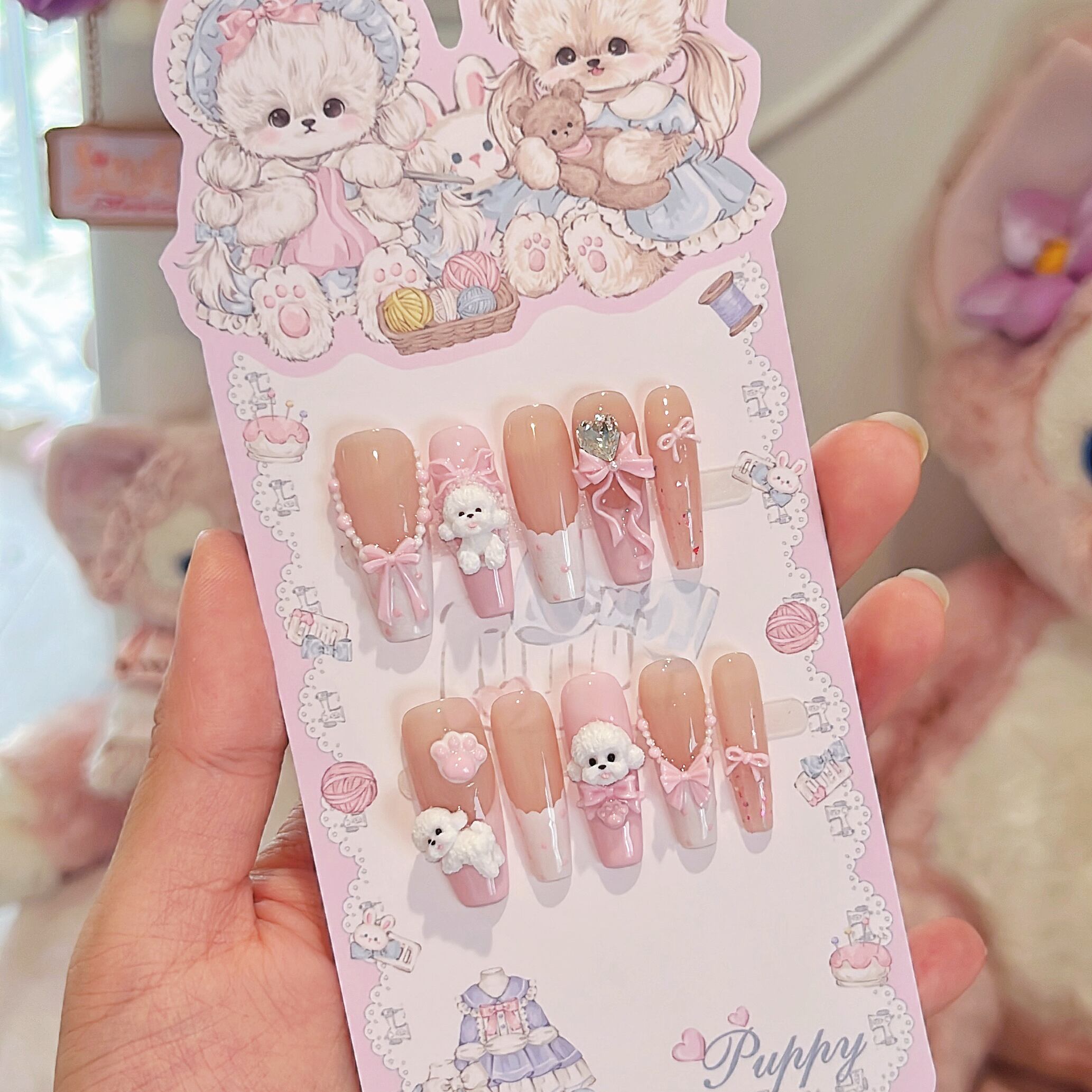 ピンクのリボンとレース、きらめくビジュー、そして愛らしいビションが、